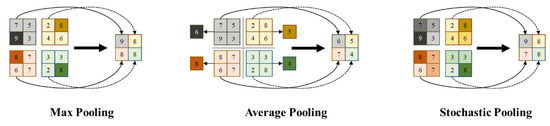 The pooling operation is one of the most important processing units in the CNN models, which plays the role of extracting representative features for captured image features, and therefore is also called the sub-sampling or down-sampling operation. After the pooling operation, the dimension of the output feature is effectively reduced, which is helpful for reducing the network training parameters and preventing overfitting. In the CNN architecture, the common pooling strategies include max pooling, average pooling and stochastic pooling, as shown in Figure 3.
