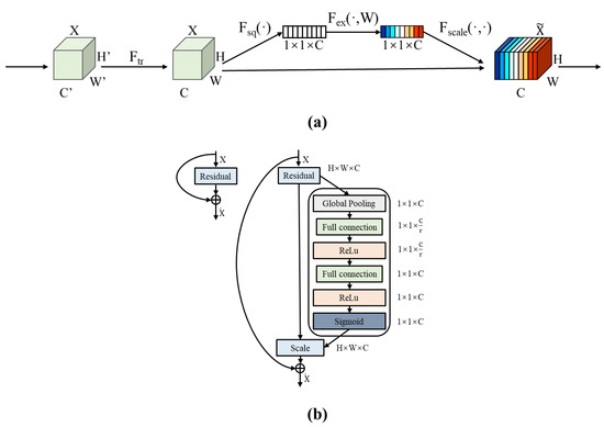 The squeeze and excitation visual attention block (SE block) was firstly proposed by Hu et al. in SE Net [19], which adds the visual attention mechanism to the CNN model in the channel direction to obtain more channel feature information, and the structure of the SE block is shown in Figure 4a.