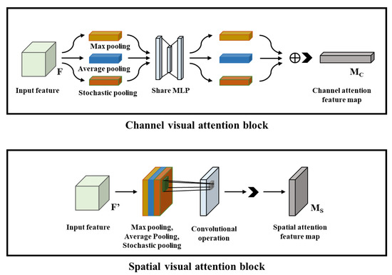 On the one hand, in the CA block, it performs the max pooling, average pooling and stochastic pooling operations on the input feature map F to simultaneously obtain the texture, contour and background information of the input image and enhance the model robustness. Finally, the computation result will be sent to an MLP shared network, which will sum the corresponding elements of the three different feature maps and output the channel attention feature map, so the CNN model not only obtains the reduced dimensionality of the output feature images in the convolutional layer, but also retains more comprehensive image features. On the other hand, in the SA block, the max pooling, average pooling and stochastic pooling are performed on the input feature maps in turn, and the results are obtained for feature concatenation. Then, the fused feature maps are subjected to a standard convolution operation to recover the feature dimension and output the spatial visual attention feature map, so the SA block can efficiently help the CNN model solve the problem of “which regions are important and which regions are minor” in the input image. In addition, both the CA block and the SA block can be flexibly deployed in the ResNet, and their embedding schemes are similar to those of the SE block.