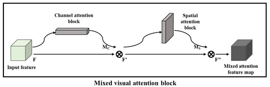 In the process of exploring the use of visual attention mechanisms in CNN models, Woo et al. found that there is still space for the upward improvement of CNN image-classification models, so they proposed a mixed visual attention block that combines the use of two types of visual attention blocks to improve the feature-extraction and image-classification performance of deep-learning models, as shown in Figure 6. Meanwhile, through experiments, Woo et al. pointed out that setting the CA block in front and the SA block in the back has a more significant performance on the model enhancement, and the increase in computational complexity contributed by this MA block to the CNN model is relatively small. In addition, the embedding method of the MA block in the ResNet model is consistent with the deployment of the SE block, CA block and SA block, which indicates the high application flexibility of the MA block.