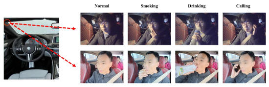 The experimental data were collected by a professional image data acquisition company, the camera was deployed in the left side of the motor vehicle above the A-pillar, which can clearly capture the driver’s driving status images, and selected two images in each category as an example. The camera deployment position and the acquired images are shown in Figure 7.
