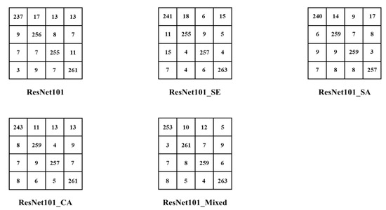Confusion matrices of ResNet101 models with visual attention blocks to further demonstrate the classification performance.