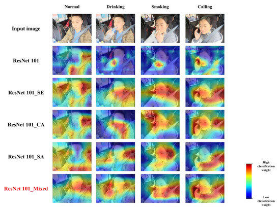 In order to observe the changes in the magnitude and distribution of the classification weights caused by embedding visual attention blocks more intuitively, taking the different-depth ResNet101 models and variant ResNet101 models as examples, one image of each category in the risky-driving-image dataset was selected for Grad-CAM visualization [23], and the visualization results are shown in Figure 9.