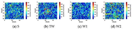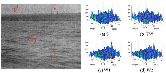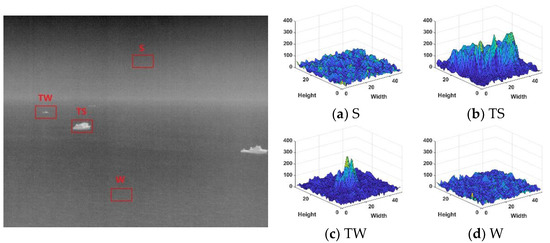 The scene information of the maritime infrared target image is relatively simple, the image has strong self-similarity, and the correlation between each image area is vital. Taking Figure 1 and Figure 2 as examples, this section will select representative local regions of the image for detailed analysis to reflect the overall image characteristics. When the target in the image is large, the contour of the target will be more complex, and when the target is dim, it will appear as a point. In the selected local area, S, TS, TW, and W were denoted as the sky, targets with complex contours, dim point targets, and sea clutter, respectively. For the rough sea images with only dim small targets, select multiple sea clutter areas to compare with the target area, denoted by W1 and W2, respectively. Analyze the characteristics of the maritime infrared image with the target, and compare the difference between the image of the calm sea surface and the rough sea image.