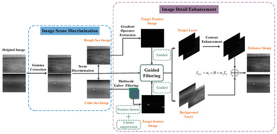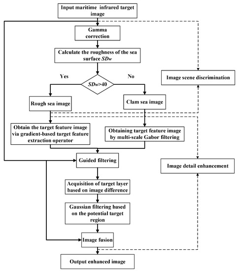 Based on the analysis of image characteristics in the previous section, an image enhancement method for maritime infrared targets based on scene discrimination was proposed. The overall process is shown in Figure 6, divided into two main steps: image scene discrimination and image detail enhancement. In the image scene discrimination, the image was mainly divided into two categories: rough sea images and calm sea images through the local variance of the sea surface area. In the image detail enhancement stage, the Gabor filter and gradient-based target feature extraction operator proposed in this paper, respectively, perform multi-scale feature extraction on two types of images. Different clutter suppression and feature fusion strategies were set to obtain the target feature images. Using this target feature image as the guide image of guided filtering, the original image was decomposed into a target and a background layer. The blurred background of the target was extracted and eliminated by Gaussian filtering based on the potential target region. Finally, the enhanced target and background layer were fused with appropriate weights to reconstruct the final enhanced image. This chapter will describe each step in detail.