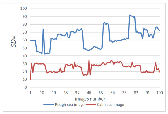 As shown in Figure 9, 100 images of calm sea and 100 images of rough sea were selected, and the local variance of their sea surface area was calculated using Equations (2) and (3), and the analysis results were plotted. of the rough sea surface is usually higher than that of the calm sea surface, and the strength of waves is proportional to the local variance of the sea surface. According to the above analysis results, when is greater than 40, it is the image taken in the scene of the rough sea; otherwise, it is the image taken in the calm sea scene.
