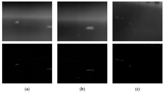 Original image of the calm sea surface and its target feature image. The upper part of (a–c) is the original image, and the lower part is the target feature image of each image.