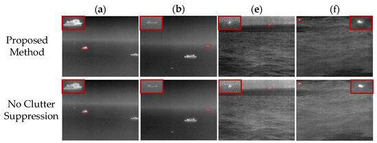In this paper, the purpose of clutter suppression on the target layer was to enhance the details of the target area and suppress the background of sea clutter. Therefore, the values of linear blur metric and clutter background suppression factor (BSF) were calculated to verify the effectiveness of this step. Table 1 shows that the and BSF of the images processed by the complete proposed method shows better performance, which can effectively reduce the blur of the image and suppress the background of sea clutter.