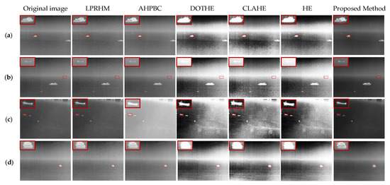 In Figure 15a–d are four images containing targets in the calm sea. The HE, CLAHE, and DOTHE methods can improve the contrast of the image. However, they have severe the “over-enhancement” phenomenon, leading to worse visual effects. The LPRHM and AHPBC method both enhance the details of the target area. Still, the LPRHM will add a lot of point noise, and the AHPBC method will reduce the contrast between the target and the background in the image. The method proposed in this paper considers both detail enhancement and contrast enhancement and achieves a good balance between target region enhancement and background suppression.