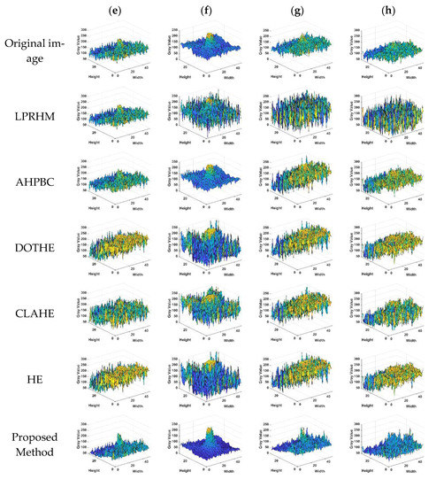 LSBR: In Figure 16g,h, the index of the proposed method is the best. However, the LSBR of the proposed method in Figure 16e,f are slightly lower than the AHPBC method. Given this, as shown in Figure 18, this paper selects the target area in Figure 16e–h, and draws the grayscale image of all the methods. All contrasting methods enhance the background noise, confusing targets and intense noise. The noise is the strongest in LPRHM and AHPBC, which significantly weakens the saliency of the target. The improvement of the LSBR value reflects the enhancement of the noise. Therefore, the proposed method can avoid noise interference and is the best performer in improving the detectability of the target.