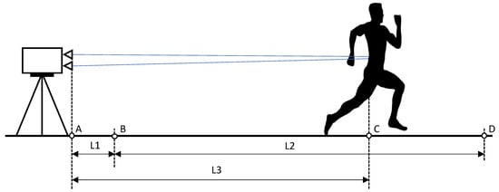 Diagram showing a sprint measurement protocol using a laser distance measurement. Legend: A—laser position, B—starting line, C—distance to the lower back of the runner, D—finish line, L1—calibration distance, L2—measuring distance, L3—the actual measuring distance of lower back to the laser measurement (L2 is calculated as the difference between L3 and L1).