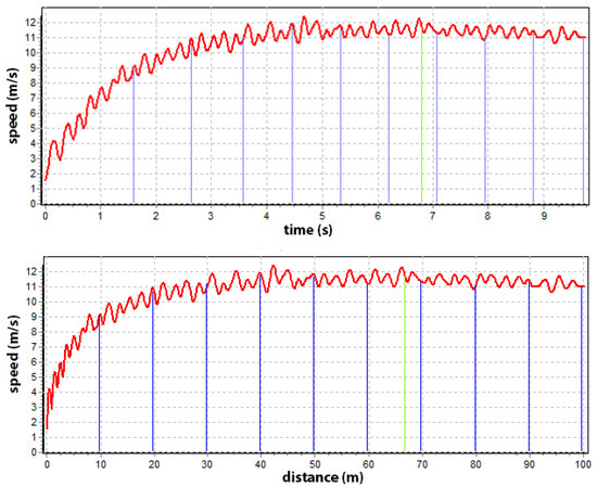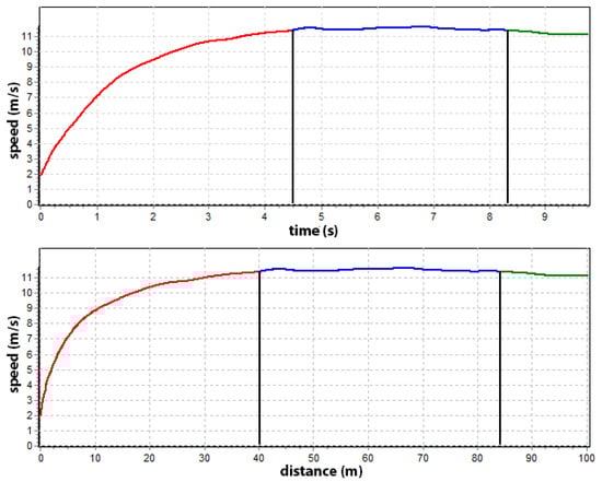 Further, we can define the speed zones, which always appear in a 100 m race, no matter the performance level. It is possible to do this via smoothed speed data. The diagram shows the three primary phases of the 100 m run: red—ascending speed, blue—maintenance of the maximum speed, and green—descending speed (Figure 5). However, in this case, the maximum speed phase is defined by a tolerance of 2% from the maximum speed. An essential element of these two graphs is that the course of the variability of the maximum speed is presented in relation to the time of exercise and the change in distance. Both charts overlap and are the same. Maintaining a maximum speed is one of the most important indexes in sprint performance.