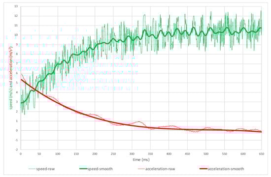where: a = acceleration, v = speed, t = time, and i = calculation point. The calculated acceleration is one of the important variables used to determine sprint performance. We have to remember that the greater initial acceleration and longer positive acceleration define better performance. In Figure 7, we can observe the runner’s speed and acceleration in time. The peak velocity is calculated from the smoothed speed curve.