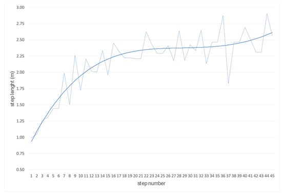 The primary criterion determining the effectiveness of a maximum speed is the length and frequency of steps and their mutual relations. High values of both these parameters have a decisive influence on the maximum speed value; they are also an indicator of the correct running technique. Using our program, we can accurately determine the length of each step. The module for automatically determining the length of the steps divides the entire run into individual steps based on the fluctuation of the speed of the run between the phase of the support phase and the flight phase. By smoothing, we eliminate the wrong calculated step length (Figure 8).