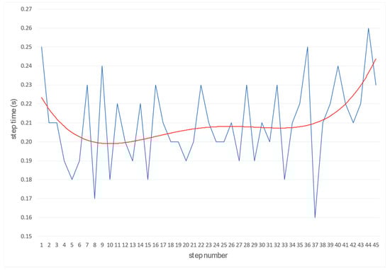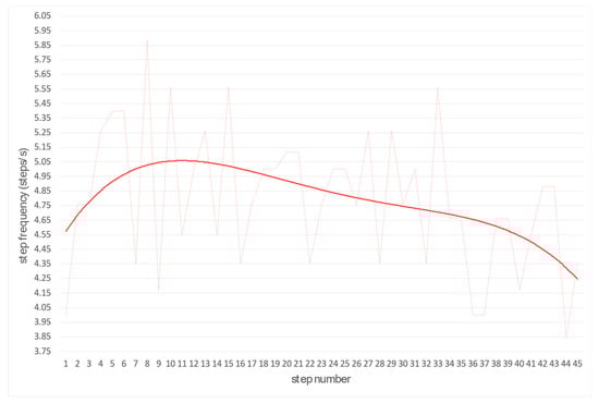 By the same principle, the frequency of the steps and the time are also calculated (Figure 9 and Figure 10). Length and frequency of steps are the basis for optimizing and adapting these two variables to achieve a higher average running speed.