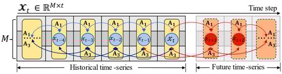In general, multivariate traffic time series involves both spatial and temporal dimensions, and our forecasting task revolves around modeling the implied spatial-temporal features to establish a study paradigm []. Following the general framework of available MF models [,], the standard MF as depicted in Figure 2 satisfies the basic process of Equation (2) as follows: