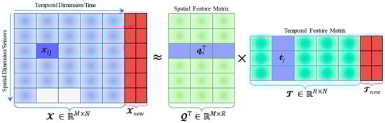where is the spatial feature matrix whose row is ; is the temporal feature matrix whose column is ; their element-wise is estimated by the inner product of and ; denotes the positive integer referring to matrix rank. In Figure 2, the future time series remains related with at the same time direction when completing the data approximation by Equation (2).