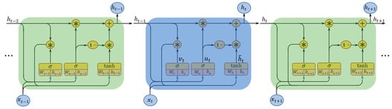 where and are the reset and update gates, separately; (, , ) and (, , ) stand for their weight and bias parameters; , , and are the previous, current, and next outputs; is the current cell state; , , and are the previous, current, and next inputs; tanh() denotes the tanh activation function; The symbol “” is the Hadamard product of the matrix. In this experiment, we use the sigmoid function (indicated by ) as the activation of the hidden state, and the hyperbolic tangent function (indicated by tanh) as the activation of output.