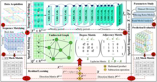 Different from those previous attempts, the DL models have emerged as the predominant traffic prediction models owing to their thorough consideration of the factors affecting traffic conditions []. The paradigm of the models manifests itself as the stacking of basic learnable blocks, or layers, to create the specified deep architectures [], and much progress has been made in related works. Among the modeling efforts, the class of methods like recurrent neural network (RNN) is famous for processing sequential data, and its variants of the long short-term memory network (LSTM) and the simplified gated recurrent network (GRN) are proven to be effective structures for resolving gradient vanishing of RNN in capturing the temporal dependencies of historical data [,]. Studies on real-world issues have verified the applicability and advantages of the LSTM or GRN in traffic forecasting tasks [,]. Unlike RNN-based temporal modeling, the graph-related models have shown a powerful impact on spatial feature learning of road networks []. Typically, the joint spatial-temporal graph convolutional network (STGCN) can efficiently raise the accuracy of traffic forecasting by modeling the multi-scale traffic networks []. Moreover, sequence-to-sequence algorithms as well as other technical tricks (e.g., attention and residual mechanisms) can also greatly augment the predictive accuracy [,]. Despite DL models performing well, the drawbacks are that the diversified spatial-temporal correlations have not been fully leveraged from traffic networks and excessive model training may worsen the overall prediction performance [,]. In contrast, matrix factorization (MF) dominates in traffic forecasting as it can rapidly capture the global spatial-temporal properties by a low-rank approximation relation. Furthermore, the regularization terms designed for factor matrices can also strengthen the modification of Matrix Factorization (MF) models [,]. Additionally, most existing studies mainly work on a historical time series assuming no missing data entries []. However, when collecting traffic data from ITS, data loss is inevitable due to the sensors or software failures [,], which makes it difficult to make accurate forecasts [].