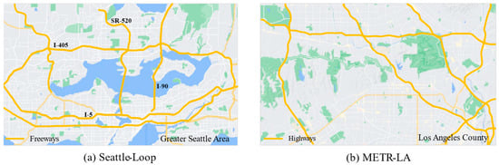 We conducted a lot of experiments on two publicly available and independent traffic speed datasets, i.e., Seattle-Loop and METR-LA for the training of ST-CRMF and its comparison with baseline models. Both datasets are widely used for traffic forecasting. The former was collected in 2015 on four connected freeways (I-5, I-405, I-90 and SR-520) in the Greater Seattle Area; the latter was collected on the highways of Los Angeles County from 1 March 2012 to 30 June 2012. Table 1 summarizes the key statistics [,] of both datasets, and Figure 5 provides their area maps [,]. In this experiment, we chose only the first two months of traffic data for modeling, and the sub-datasets were split in chronological order with 70% serving as the training set and the remaining 30% as the testing set.