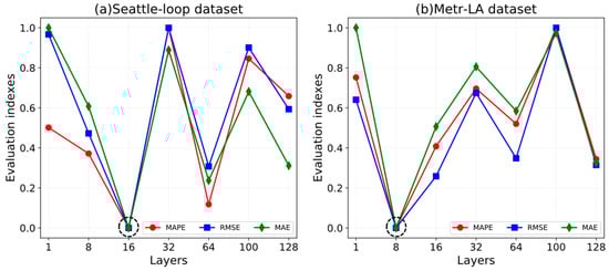 At first, the hidden layer of GRN exerted an influence on the prediction results of the ST-CRMF. For 5-min traffic forecasting, we undertook the parameters analysis by adding the hidden layers from 1 to 128. Figure 6 displays the parameter sensitivity of the ST-CRMF model with varying layer settings. We can observe that the ST-CRMF achieves better performance when the hidden layers of datasets (S) and (M) are set to 16 and 8, respectively.