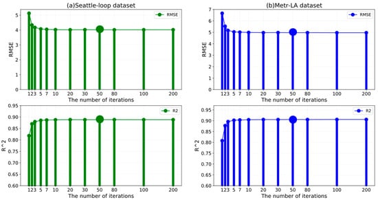 The number of iterations of the ST-CRMF model on the Seattle-Loop and METR-LA datasets.