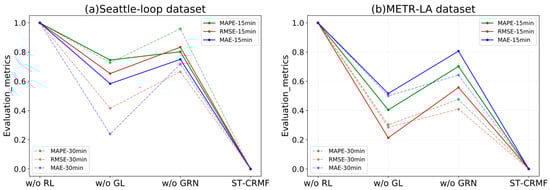 Similar to [,,], we conducted a comprehensive ablation study on the Seattle-Loop and METR-LA datasets to investigate the effectiveness of key components that contribute to the improved results of the ST-CRMF model. We named the ST-CRMF without different components as follows: (1) ST-CRMF w/o GL: ST-CRMF without the graph Laplacian spatial regularizer; (2) ST-CRMF w/o GRN: ST-CRMF without the GRN temporal regularizer; (3) ST-CRMF w/o RL: ST-CRMF without the residual learning; and the baseline for the ablation study was the ST-CRMF model. Figure 9 shows the metrics of the ablation experiments for 15- and 30-min traffic forecasting tasks. We can conclude that: (1) compared with ST-CRMF model, all of the simplified ST-CRMF models will cause performance degradation; (2) both spatial and temporal regularizations of MF can improve its forecasting accuracy, but the latter is more effective; (3) the effect of bi-directional residual modeling is most evident as it further extracts more spatial-temporal information from residuals. All in all, this finding confirms that each component of the ST-CRMF model is indispensable for traffic time series forecasting.