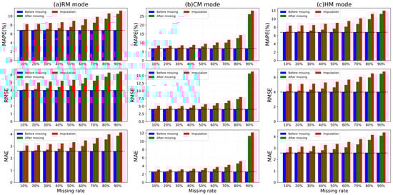In terms of prediction, we can observe that the evaluation metrics of the ST-CRMF increased under missing data relative to the non-missing case. More precisely, as the missing data rate increased, it satisfied the change that the forecasting accuracy of our ST-CRMF model remained at a high level but gradually followed an accelerated declining tendency. Specifically, for the extreme missing data rates exceeding 80%, the performance of the ST-CRMF model deteriorated so sharply that the forecasting tasks almost failed. Meanwhile, the different scenarios have different influences on the ST-CRMF. For the three scenarios, the MAPE, RMSE, and MAE of the ST-CRMF model varied most markedly under the CM mode due to its heaviest data structure corruption. Instead, the RM mode did impair the performance of the ST-CRMF model the least, which was in line with expected. Consequently, we should avoid the continuous loss of a large portion of time series during the acquisition phase. Besides, it can be found from Figure 10 that the repair results of ST-CRMF model followed its forecasting pattern when facing varied combinations of missing data rates and scenarios. Therefore, we can conclude that our ST-CRMF can deliver excellent prediction and repair results (except for extreme cases) under complex missing conditions.