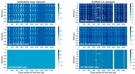 We carried out a visualization survey for the ST-CRMF model to further validate its effectiveness. Figure 11 shows the heat maps of the ground and predicted values of ST-CRMF for 15-min forecasting. Of these, for datasets (S) and (M), which all exhibit the obvious periodic variations in Figure 11, our ST-CRMF model captured the periodicity better. Meanwhile, these residuals were very small overall, which also indirectly illustrates the superiority of the ST-CRMF model. In conclusion, both the above theoretical and visualization results indicate that our ST-CRMF model can effectively and accurately complete the tasks of forecasting and recovery of traffic time series.