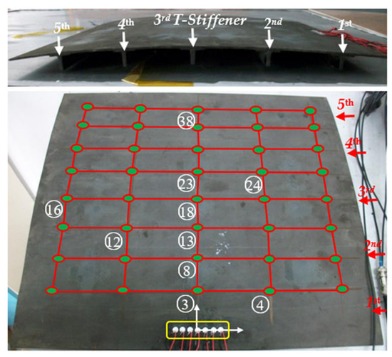 The experiment is conducted on a stiffened curved composite panel with 2 mm thickness, 500 mm length, and 475 mm width. The composite panel is made of T300 carbon fiber with five stiffeners evenly arranged along the curved edge, as shown in Figure 2. The array used in the experiment is a uniform linear sensor array bonded on the structure surface with seven piezoelectric (PZT) sensors. The PZT sensors’ diameter and thickness are 8 mm and 0.48 mm respectively. They are arranged with a space of 10 mm to meet the condition , and are labeled as PZT S1 to PZT S7 respectively from the left to the right. The integrated structural health monitoring scanning system (ISHMS) is applied to sense acoustic emission signals. Low-velocity impacts induced by an impact hammer are performed at selected positions on this structure, as shown in Figure 2. The sampling rate is set to 2 MHz and the sampling length to 10,000 including 2000 pre-trigger samples.