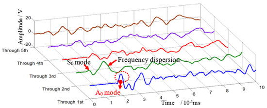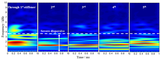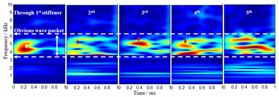 In this section, typical impact response signals are chosen for time analysis and time-frequency analysis. When this impact occurs and propagates through the first to fifth stiffener, the typical outputs in the time domain of the PZT S4 sensor are shown in Figure 3. It shows that the received signals are complicated and have more mode conversions and dispersive behavior when crossing the second T-stiffeners than the first, and this phenomenon becomes more and more serious when the wave crosses more T-stiffeners.