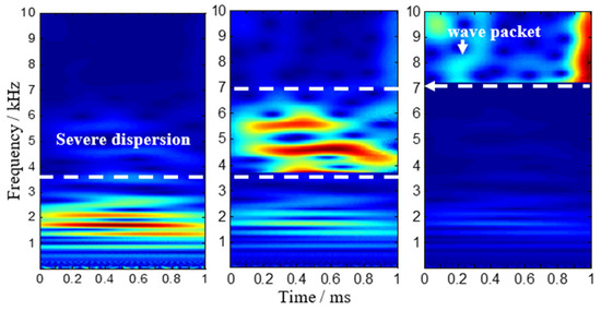 According to the sensor array-based method, the signal model requires that the input signals should be narrow-band frequencies. However, the waves caused by low-velocity impact are wide-band signals. CWT can modify the length of the wavelets at different scales to adaptively analyze signals. The Gabor function was adopted in this study because it is known to provide a better resolution both in the time and frequency domain than any other wavelets [12]. Here, the Gabor wavelet transform is applied to analyze the non-stationary impact signals of this stiffened curved composite panel, and the time-frequency spectrogram is obtained using CWT, as seen in Figure 4. It shows that a wave packet appears between 4 kHz and 5 kHz in the first time-frequency spectrogram, but there cannot exist a clear first wave packet in the other four spectrograms due to the presence of the dispersive wave below 4 kHz. In order to reduce the influence of low-frequency signals, the time-frequency spectrogram after filtering is obtained in Figure 5. A wave packet obviously exists in the first four spectrograms, but it is still not clear in the last one. For the outputs of the PZT S4 when the impact signal crosses the fifth T-stiffener, the time-frequency spectrogram after further filtering is obtained in Figure 6, and a wave packet appears around 8 kHz. Using continuous wavelet transform, we can extract a narrowband signal that purely corresponds to the frequency and mode of interest for analysis.