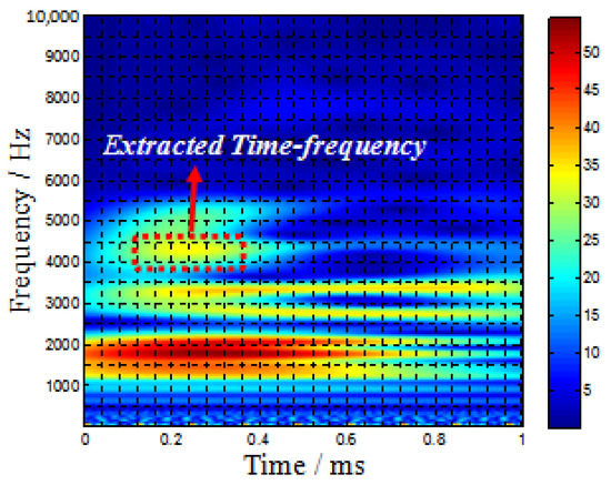 The impact at the point when it across 2nd T-stiffener as a typical case to be analyzed. Figure 7 shows the time-frequency spectrum of PZT S4 which is a typical case that represents the frequency characteristics of the impact-induced elastic signal obtained by the PZT sensors. The wave fronts of the A0 and S0 mode of the signals can be decided by checking the velocities of these two modes when excited [13]. Figure 8b shows the filtered 4.1 kHz frequency of the typical impact case, and the direct wavefronts that purely correspond to the A0 mode can be found between 0.1 ms and 0.3 ms, which can be extracted for analysis and used as the input vector of the 2D-MUSIC model.