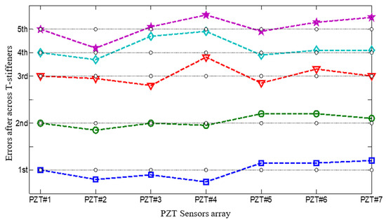 To investigate the gain-phase errors’ effects on Lamb waves, the Gabor wavelet was chosen to extract the wavelet envelope curves at a specific frequency. The array responded signals were obtained by CWT filtering of the 4.1 kHz frequency component at the simulated impact source position shown in Figure 8. The peak of the direct wave is selected to measure the gain-phase difference. Similarly, we can obtain the gain-phase errors when Lamb waves cross different numbers of T-stiffeners obstacles, as demonstrated in Figure 9.