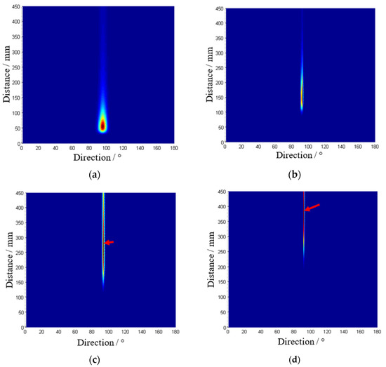 According to the continuous wavelet transform on typical outputs of the PZT sensors after filtering, the suitable frequencies of 4.1 kHz, 4.8 kHz, 5.0 kHz, and 8 kHz of typical outputs of the PZT sensors are selected when impact signals cross one, two, three, and five T-stiffeners, respectively. Those purely wave packets correspond to A0 mode and are substituted into its steering vector to estimate the azimuth of the signal source. Four impacts, including (a) No. 3, crossing one stiffener, (b) No. 13, crossing two stiffeners, (c) No. 23, crossing three stiffeners, and (d) No. 38, crossing five stiffeners, are shown in Figure 10, which are in good agreement with the actual impacts. The maximum error is at the No. 38 impact position where Lamb waves cross five stiffeners. Its direction and distance error is 1° and 2.4 cm respectively.
