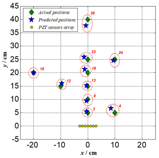 Ten low-velocity impacts are performed at various positions marked with numbers on the structure shown in Figure 2. To guarantee the time resolution and narrowband signal extraction, a suitable frequency and time are firstly extracted as the central frequency in the narrowband signal extraction processing using CWT. Additionally, they are substituted into the steering vector to estimate the impact positions. The location results in Polar coordinates using the 2D-MUSIC algorithm which propagates through different directions of stiffened parts and their Cartesian coordinates are listed in Table 1. All estimated results errors are compared with actual impact points and are also listed in Table 1. For impact localization results obtained by the proposed method, the maximum error of distance estimation is less than 2.4 cm and the maximum error of direction estimation is less than 3°. In Cartesian coordinates, the maximum error of x is less than 1.3 cm and the maximum error of y is less than 2.4 cm. Selected impact locations results in Cartesian coordinates are graphically shown in Figure 11. The experiment results verify the piezoelectric sensor array-based impact location method through mode identification with the proposed continuous wavelet transform can effectively monitor stiffened curved composite panels with high accuracy.