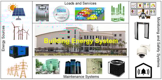 Thus, these microgrids are presently evolving as intelligent local grids, called “smart microgrids”. These provide unique features to the electricity consumers, such as demand-side management by peak load curtailment or shaving, deregulated marketing (dynamic pricing options with real-time trading), forecasting for contingency readiness, demand response, outage management, energy conservation, energy efficiency enhancement, etc. [4]. To maximize the efficiency and productivity of a smart microgrid, the integration of various components in and around a building plays an important role [5]. These include various types of energy sources, loads and service equipment, monitoring and safety systems, and maintenance systems, as shown in Figure 2, where information can be exchanged through wired or wireless communication. However, the intermittent behavior of renewable energy sources lessens the fruitfulness of the microgrids by complicating their responses to real-time loading.