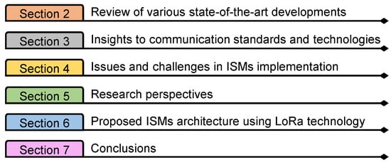 From these works, it is understood that most of the research work focuses on smart grids; few have addressed microgrids. Additionally, few works have discussed the standalone communication technologies, which can help us understand the communication concepts. So, it is evident that ISM-based analysis has not been conducted so far. For this purpose, this paper presents a comprehensive investigation into the state-of-the-art developments, insights into communication standards, technologies, and issues/challenges present in ISM deployment. This paper also discusses key future research perspectives followed by a proposed ISM architecture using LoRa (Long Range) technology. All of these are covered in various sections of the paper, as shown in Figure 3.