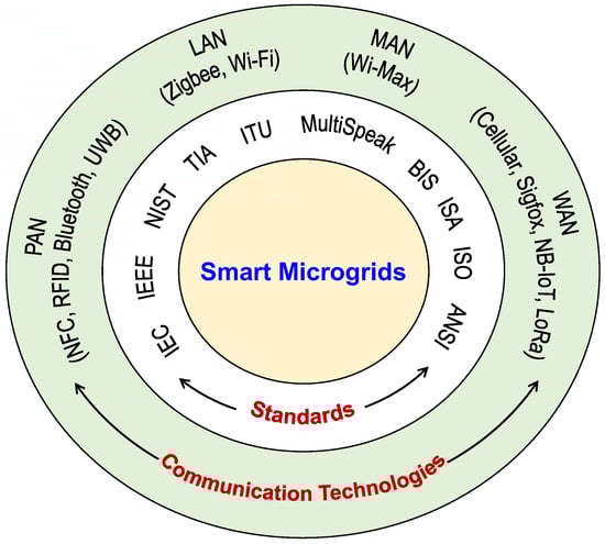 As smart microgrids are one of the unique recent developments in the energy sector, their establishment requires a standard process to be followed. Thus, it is very important to understand various standards that contribute to the development of smart microgrids. Various renowned forums or agencies define different standards to be applied globally for the development of smart grids/microgrids. Further, to implement the architecture for the smart microgrid, one must have a detailed knowledge of the various technologies available. In the present-day scenarios, wireless communication technologies are outperforming wired-based solutions by offering advantages, such as mobility, convenience, easy installation, and low cost. All these key standards and technologies are noted in Figure 4, which are explained in the following subsections.