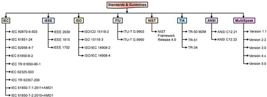 Standards provide procedures/detailed descriptions that can be followed universally. Governments and industries all around the world have recognized the importance of standards in the energy sector. Standards help to ensure quality and safety, and facilitate communication. In the absence of standards, it is difficult for manufacturers to design or implement a system which can be utilized globally. The smart grid does not just require a single standard; rather, its implementation will the use of several standards. Various standards and guidelines related to smart grid/microgrid communication are given in Figure 5 [75,76,77,78,79,80,81,82]. Some of the major contributors in this direction are IEC (International Electrotechnical Commission), IEEE (Institute of Electrical and Electronics Engineers), ISO (International Organization for Standardization), ITU (International Telecommunication Union), TIA (Telecommunications Industry Association), ANSI (American National Standards Institute), and MultiSpeak.