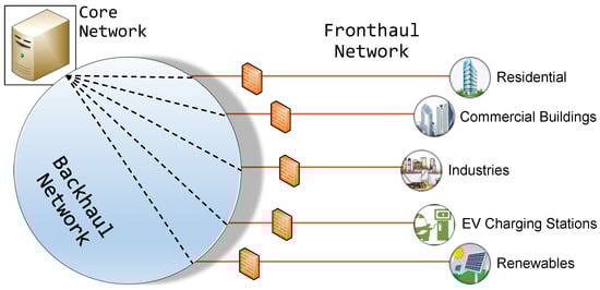 To manage complex power systems effectively, information flow across various elements of the network is crucial. The typical connectivity scenario between various players involved in the smart grid is shown in Figure 6. Here, the entire network is built based on a fronthaul network, a backhaul network, and the core network. The fronthaul network connects end-users to the backhaul network. The backhaul network refers to the transmission of a remote signal from the fronthaul network to the central station (in the core network). This network consists of a high-capacity channel, which is capable of transmitting the data at higher data rates. The core network is a global network which interconnects the networks of different locations/systems, providing a path for the information exchange among them.
