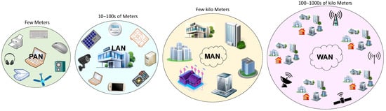 In the past, there was no communication between the generating station and the end-user. With the advancement of technologies in communication, now, bidirectional communication is possible, and thereby energy can be effectively managed between the generating station and the end-user. When compared to the traditional grid, the smart grid consists of several sensors and actuators. Sensors are used to collect data from various pieces of equipment with the help of controllers. The data can be sent to the server/cloud with the help of communication technologies. The collected data are used to analyze the performance of the equipment. Additionally, the actuators are used to control the grid components effectively. Generally, the system networks can be established in various fashions, such as personal area network (PAN), local area network (LAN), metropolitan area network (MAN), and wide area network (WAN), based on their distance of coverage, as shown in Figure 7. The PAN is a region where devices are connected within a person’s workspace (shorter distance). The major technologies used in PAN are Bluetooth, Radio-frequency identification (RFID), and Near-field communication (NFC). Bluetooth was developed by Bluetooth Special Interest Group and uses industrial, scientific, and medical bands (2.4 GHz). The latest Bluetooth Low-Energy (BLE) technology consumes little power by being in range. This technology is typically used to share files, images, videos, audio files, etc. The RFID technology is used to exchange information between the devices which are in close proximity. This works with the help of a tag and reader, where each tag is equipped with a unique number. This tag can be attached to the object (of desired application), which will be identified by the reader. Some of the applications are FASTag (toll collection system in India), tracking goods in warehouses, etc. NFC is a subset of RFID, but its range is even more limited. It is widely used in contactless credit card swiping and payments via mobile applications.