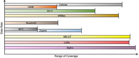 All these technologies can be arranged as shown in Figure 8 with respect to the range of their coverage and data rate support. Thus, based on the application requirements, suitable communication technology has to be selected.