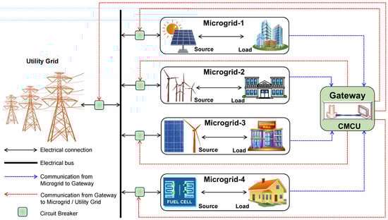 The microgrid consists of three types of power converters, namely, grid-feeding, grid-supporting, and grid-forming power converters. In island mode, these converters should maintain the voltage and frequency in the desired range [64]. A microgrid central controller achieves synchronization in grid-forming power converters. Noise and the synchronization signal delay play a significant role, and can also lead to a quality loss in the grid-forming power converters. The RS-485 communication protocol is used to implement the system. Further, to achieve robustness, the FM signal is used as a synchronization signal. During extreme events (flood, earthquake, hurricane, etc.), the healing time of a microgrid, which is called resilience, is very important. One should have a thorough knowledge of microgrids from end to end to help in this situation. So, the management of networked microgrids for riding through extreme events is essential. In this view, community resilience microgrids are used to share the energy generated by their sources within a community [12,65]. Though it can be used in normal operating conditions, it has great impact in emergency situations. The unique operational characteristics of these microgrids are also presented. Electricity ethnography (a three-month analysis) was conducted at an off-grid village in rural India (1 February–30 April 2016)) [66]. This report discussed how social relations and diverse cultural values influence the exchange of energy between village households. Two types of energy exchanges (energy-sharing and energy-trading) are discussed. The integration of four microgrids with the help of the Internet, i.e., cloud-based service (SaaS), is discussed in [67]. The individual components of the microgrid are connected (IEEE 802.11s-based mesh network) and all these are connected to a gateway. All four gateways are connected to the cloud platform with the implementation of IEC61850 GOOSE messages. Further, a bilevel distributed optimization algorithm was developed using LabVIEW and NS-3.