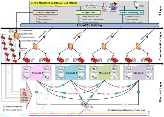 - Yang, H.; Li, Q.; Chen, W. 9—Microgrid Communication System and Its Application in Hierarchical Control. In Smart Power Distribution Systems; Yang, Q., Yang, T., Li, W., Eds.; Academic Press: Cambridge, MA, USA, 2019; pp. 179–204. ISBN 978-0-12-812154-2. [Google Scholar] [CrossRef]