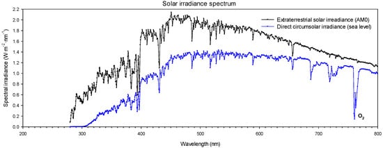 Extraterrestrial solar irradiance (outside the Earth’s atmosphere) and direct circumsolar irradiance spectral data [] at sea level based on historical data from 1987 to 2003 within the spectral range of 200–800 nm. It shows the O2 absorption band.