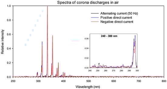As seen in Figure 3, a complete spark discharge in atmospheric air emitted light between below 200 nm and 800 nm, thus emitting more visible spectral components compared to corona discharges. It is worth noting that the spectra of discharges occurring on the surface of solid dielectrics are more complex and depend on different factors, including the composition of the solid material, the condition of the surface, and the composition of the gases [].
