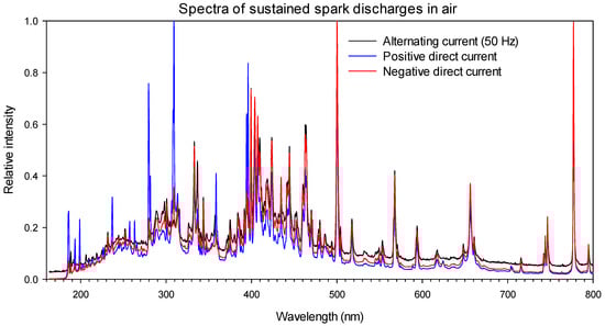 Figure 3 shows the light spectra of a sustained spark discharge (electric arc) in a needle-plane air gap acquired for this work with the same equipment used in Figure 2 at the AMBER Laboratory of the Universitat Politècnica de Catalunya. The results presented in Figure 3 clearly show that the spectra of the sustained spark discharges were more energetic and covered a wider spectral range within both the UV and visible regions.