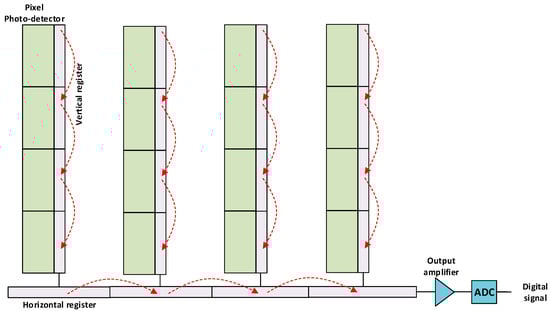 In CCD image sensors, the weak electrical signal generated by each pixel moves through the circuit via vertical and horizontal shift registers, which convert the charge to voltage. The light level is then sampled in the readout circuitry, which includes an amplifier and an analog-to-digital converter (ADC). Therefore, the electrical signal generated by each individual pixel must move around the array, as seen in Figure 4, which requires power and time because the register content is read out serially.