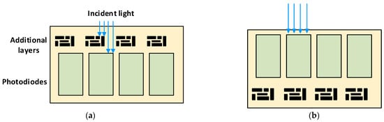 Back-illuminated image sensors are more sensitive than front-illuminated sensors because back-illuminated sensors have a higher fill factor, that is, the ratio of the effective light-sensitive area to the total area of a pixel [], so image sensors with higher fill factors tend to be more sensitive. For this reason, front-illuminated sensors have additional layers of wiring, transistors, and capacitors on top of the photodiode. These additional layers tend to scatter and absorb incident light, resulting in a poorer light-to-charge conversion factor. This issue is overcome by the use of back-illuminated sensors, where the additional layers are built on the side opposite to the incoming light, as shown in Figure 6, so that the incident light encounters fewer layers above the photodiodes.